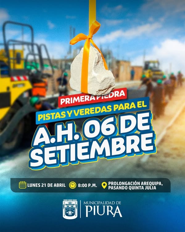 La Municipalidad Provincial de Piura dará inicio este lunes 21 de abril, desde las 8:00 pm, a la ejecución del proyecto de mejoramiento de pistas y veredas en el asentamiento humano 06 de Setiembre, con una inversión superior a los S/ 3 877 884.33.