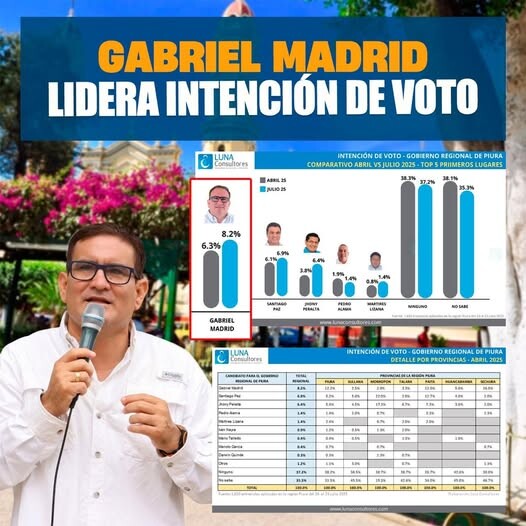 Política Gabriel Madrid lidera intención de voto para el Gobierno Regional de Piura, según sondeo de Luna Consultores sin hacer campaña Viernes, 1 agosto 2025A un año de las elecciones, la carrera por el Gobierno Regional de Piura ya tiene un primer favorito. El actual alcalde agosto 1, 2025 No hay comentarios