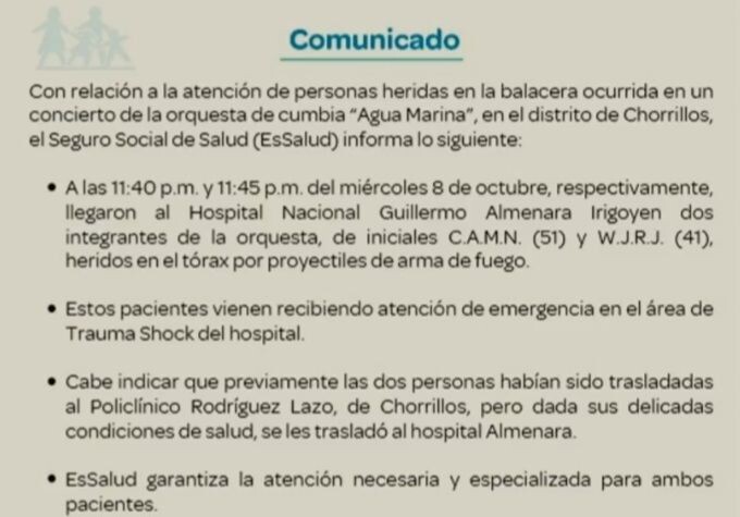 EsSalud informó que los otros dos integrantes afectados en el atentado son César More, tecladista de la agrupación, y Willy Ruíz, animador. Ambos se encuentran internados en el Hospital Almenara de La Victoria, donde reciben atención médica especializada.