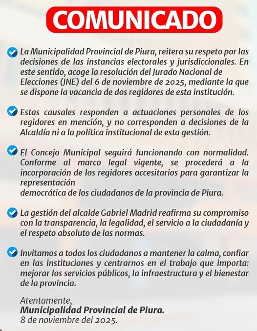 Sábado, 8 noviembre 2025La Municipalidad Provincial de Piura informa a la opinión pública que respeta plenamente las decisiones jurisdiccionales y acoge la resolución emitida por