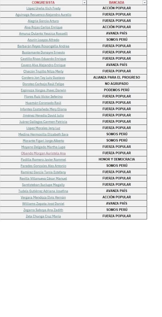 Parlamentarios votaron, junto a otros 31 legisladores, a favor de la cuestión de orden que buscaba frenar el proceso y evitar la salida de Jerí. La maniobra fue interpretada por varios sectores como un intento de blindaje político en un momento clave.