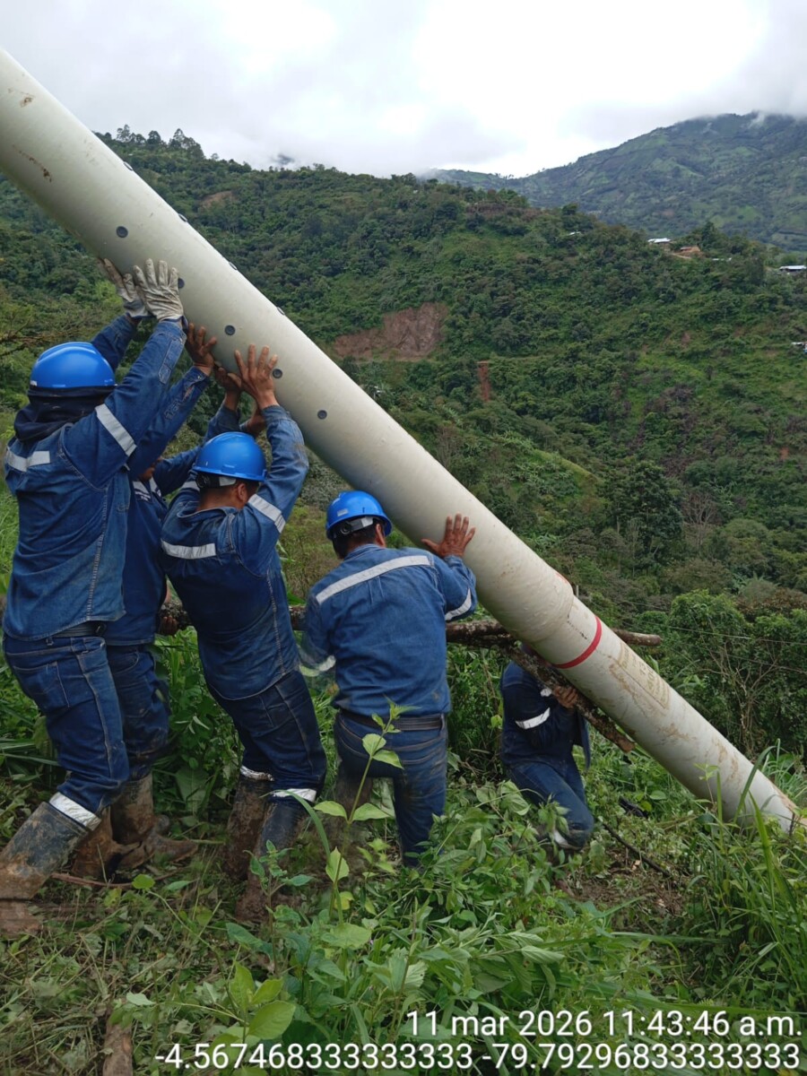 Entre trochas dañadas por las lluvias, cerros empinados y caminos casi intransitables, cuadrillas técnicas junto a pobladores realizaron una larga caminata cargando un poste de 13 metros sobre sus hombros para restablecer el servicio eléctrico en la provincia de Ayabaca.